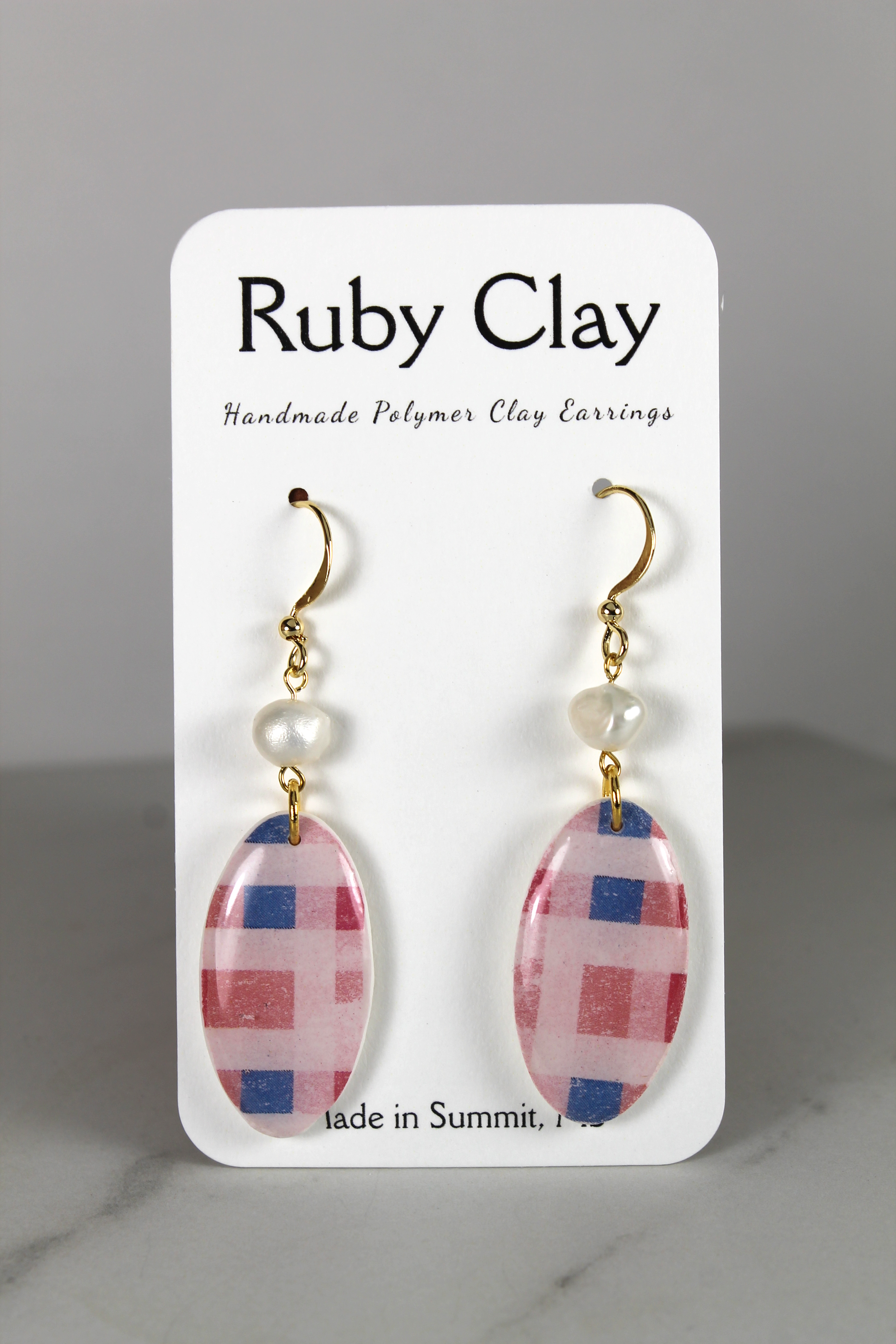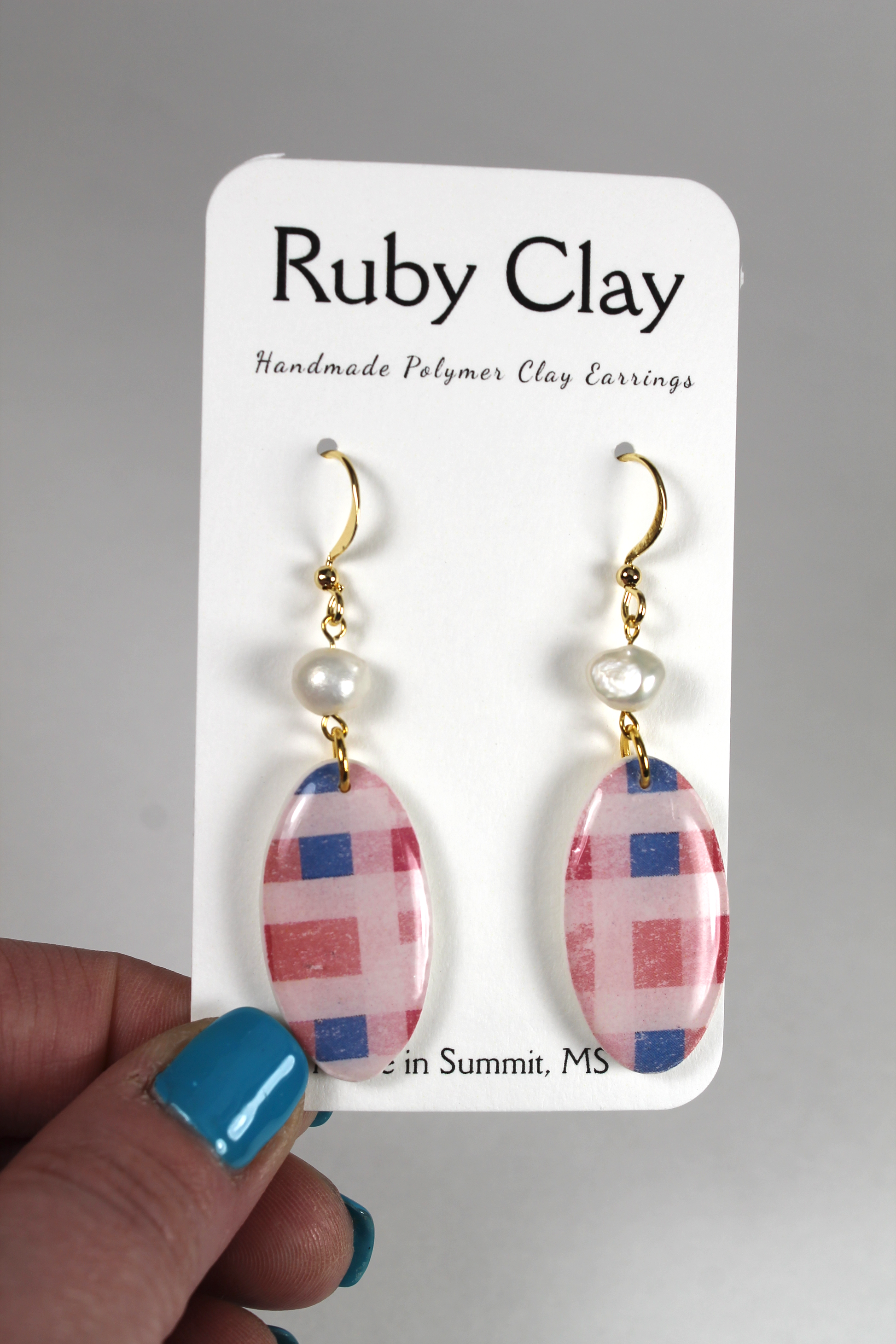 Pink, red and blue plaid ovals with a pearl attachment.