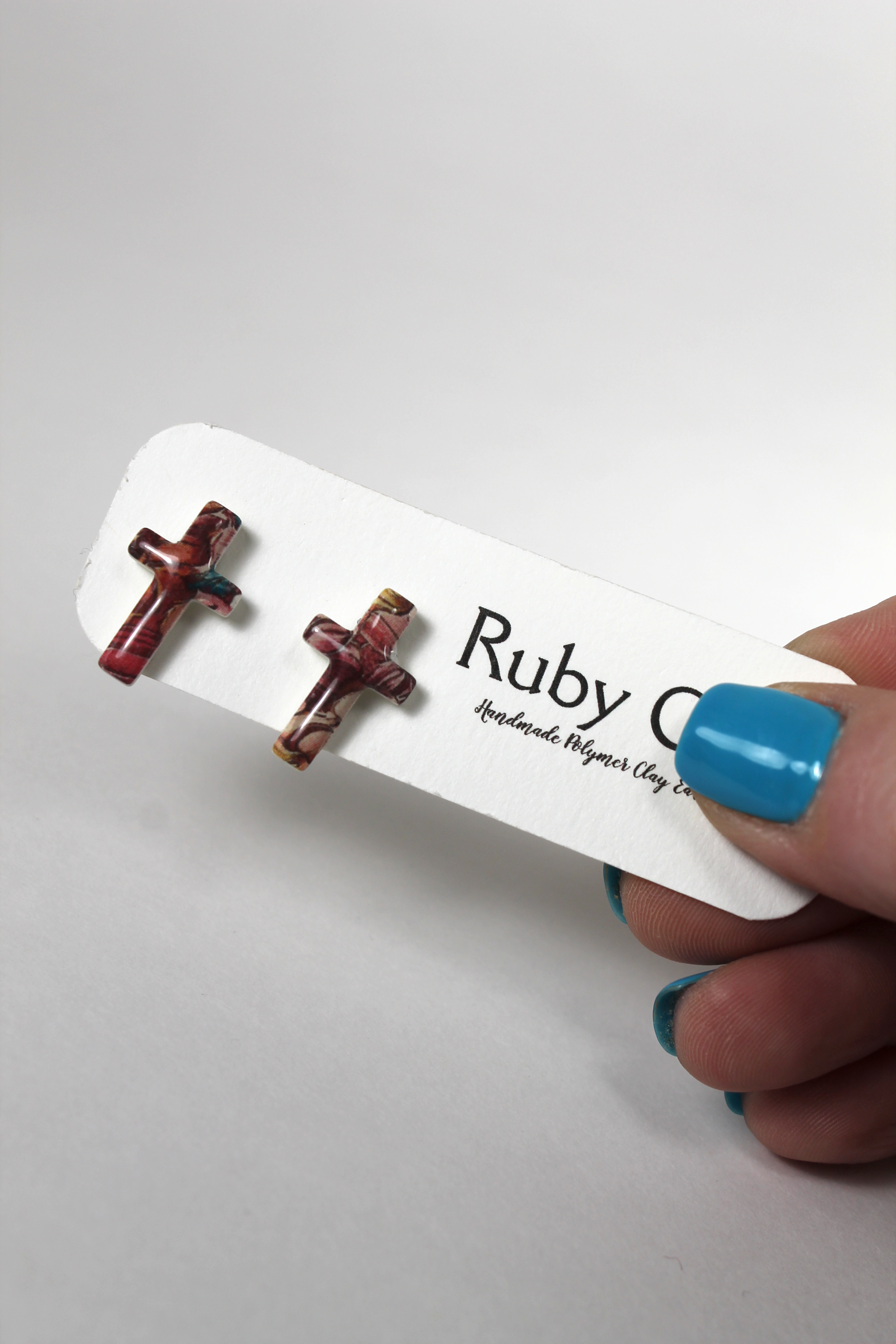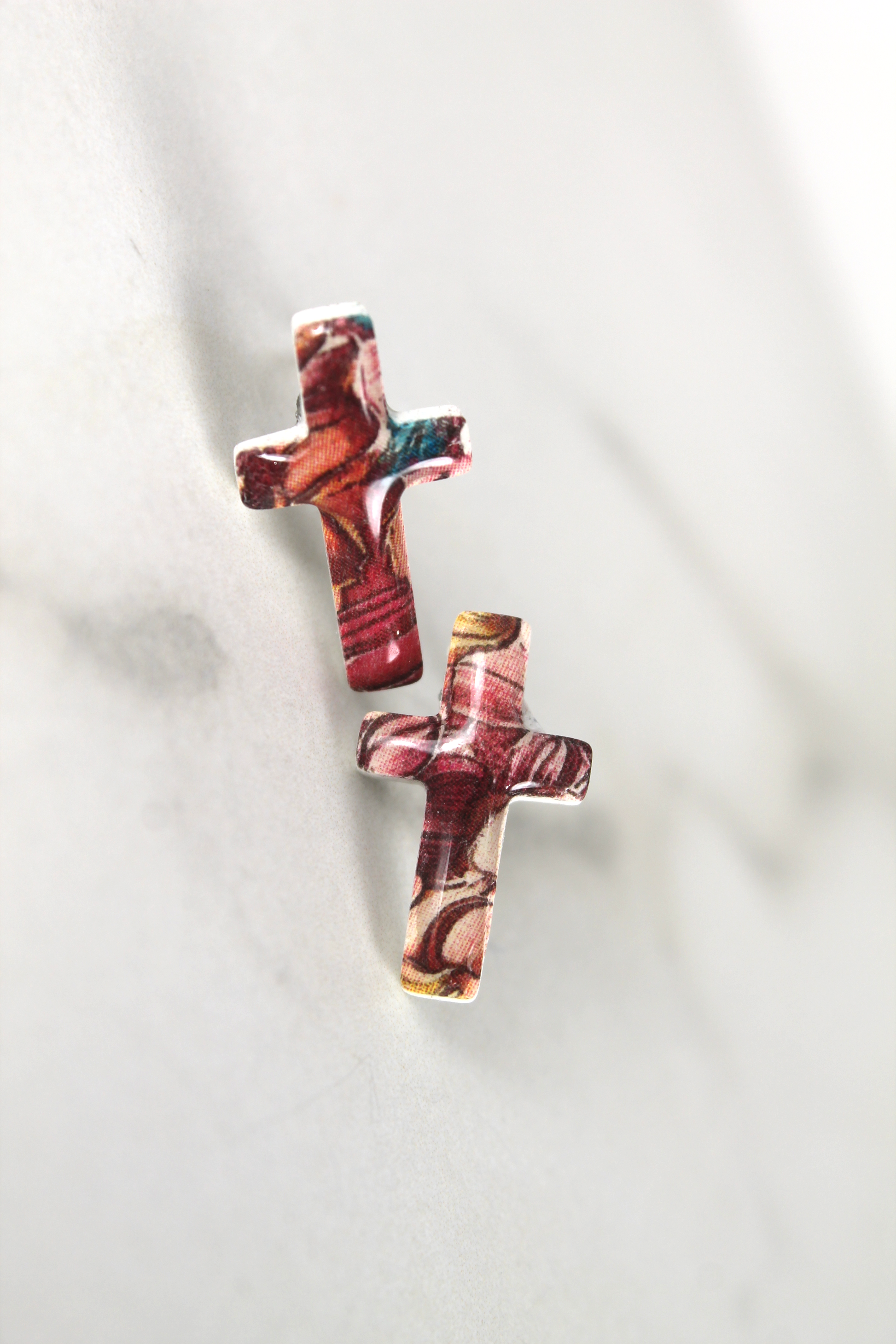 Elegant cross studs with a stained glass pattern topped with a shining coat of resin.